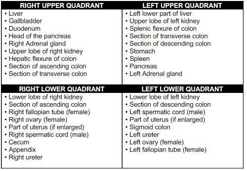 The above lines intersect and divide the abdomen into four quadrants (clockwise from the top)